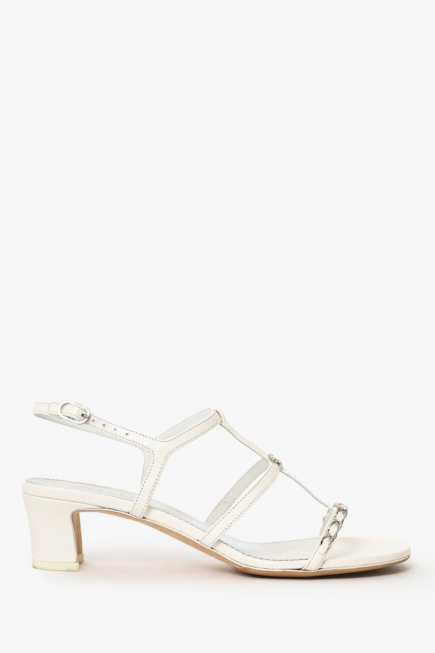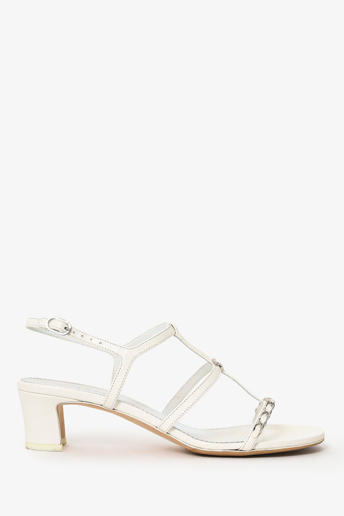Pre-Loved Chanel™ 2023 White Leather Interlocking CC Logo Slingback Sandals. Slip on. Round-open toe. Adjustable slingback ankle strap with pull-through closure. Silver-tone hardware. Tonal stitching.