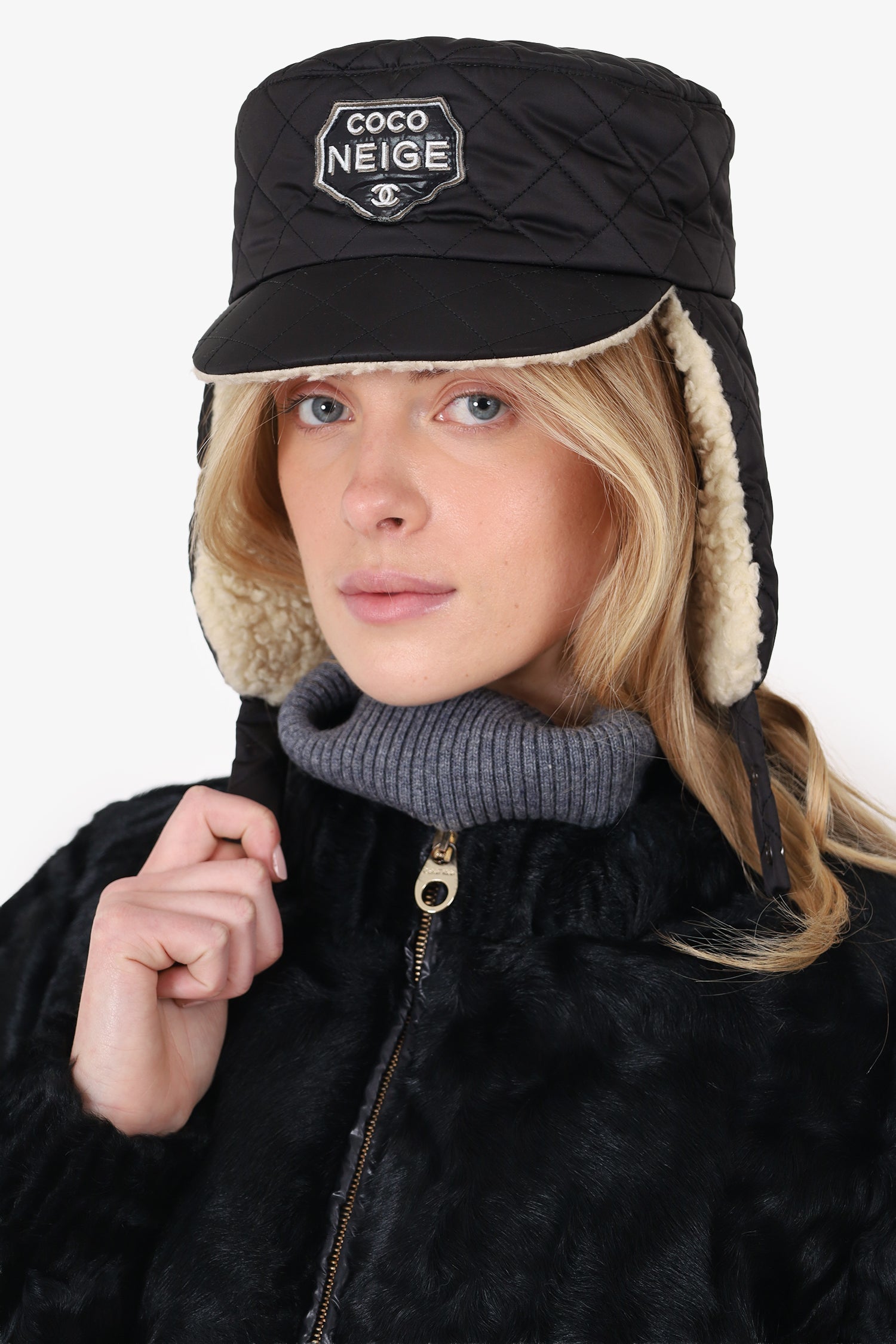 Pre-Loved Chanel™ Black Quilted Trapper 'Coco Neige' Hat With Cream Shearling Size M