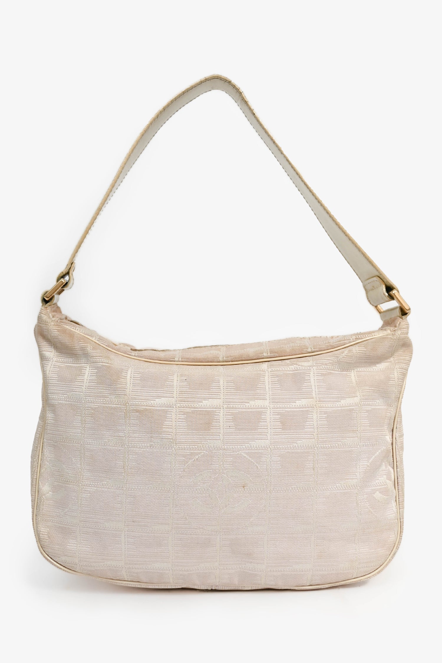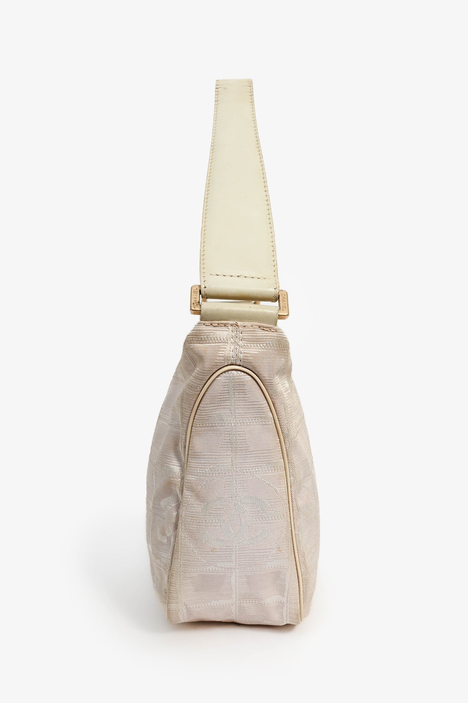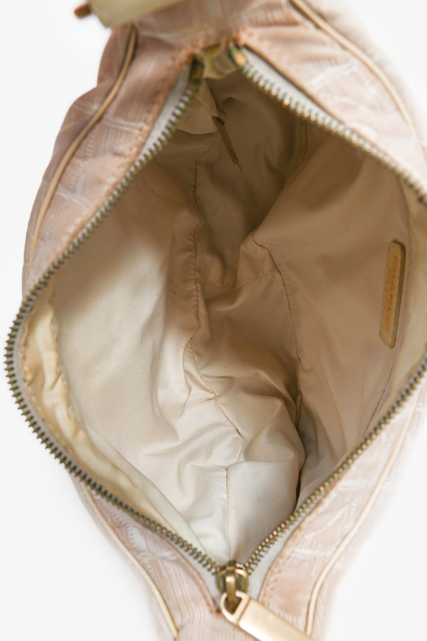 Pre-Loved Chanel™ Pink Nylon Travel Ligne Shoulder Bag. Top zipper closure. Single interior compartment with a wall zip pocket. Tonal textile lining. Gold-tone hardware. Tonal stitching.