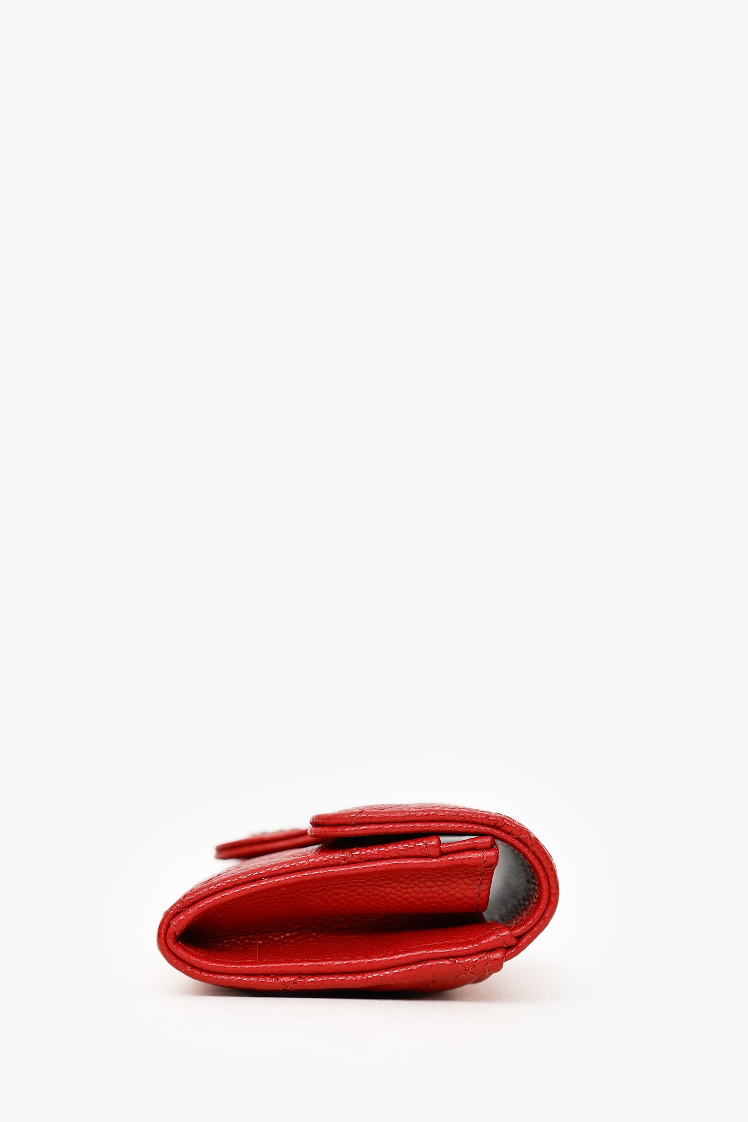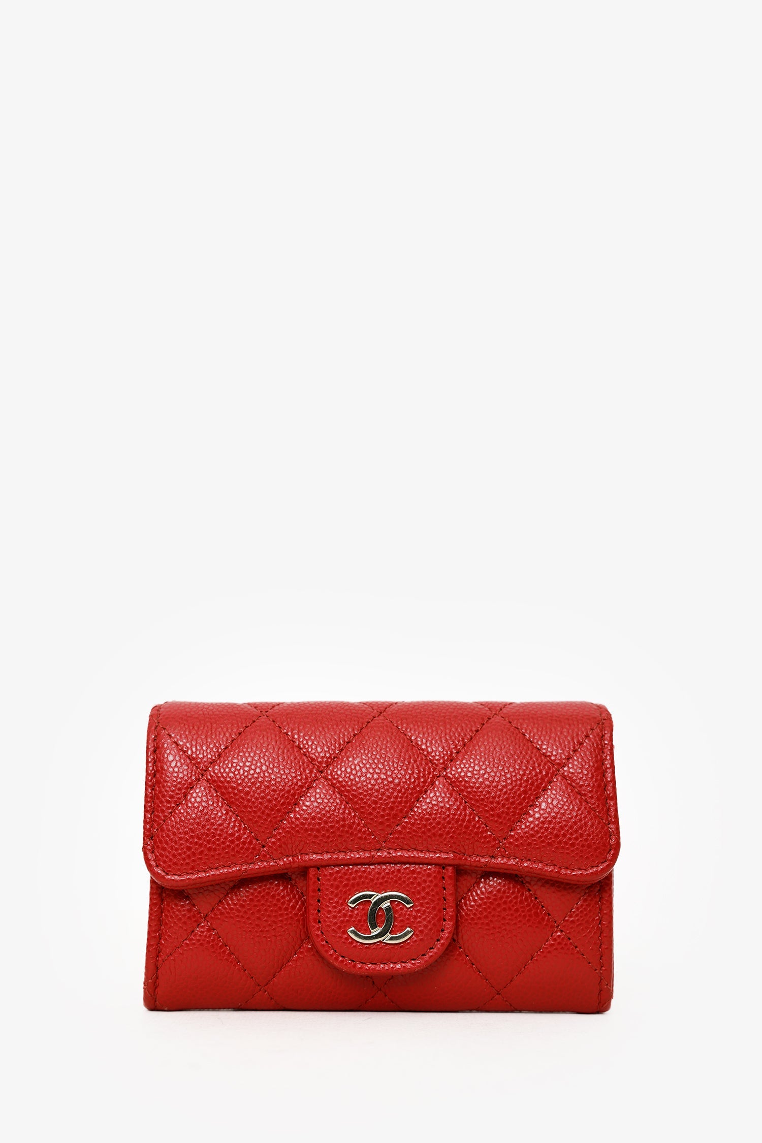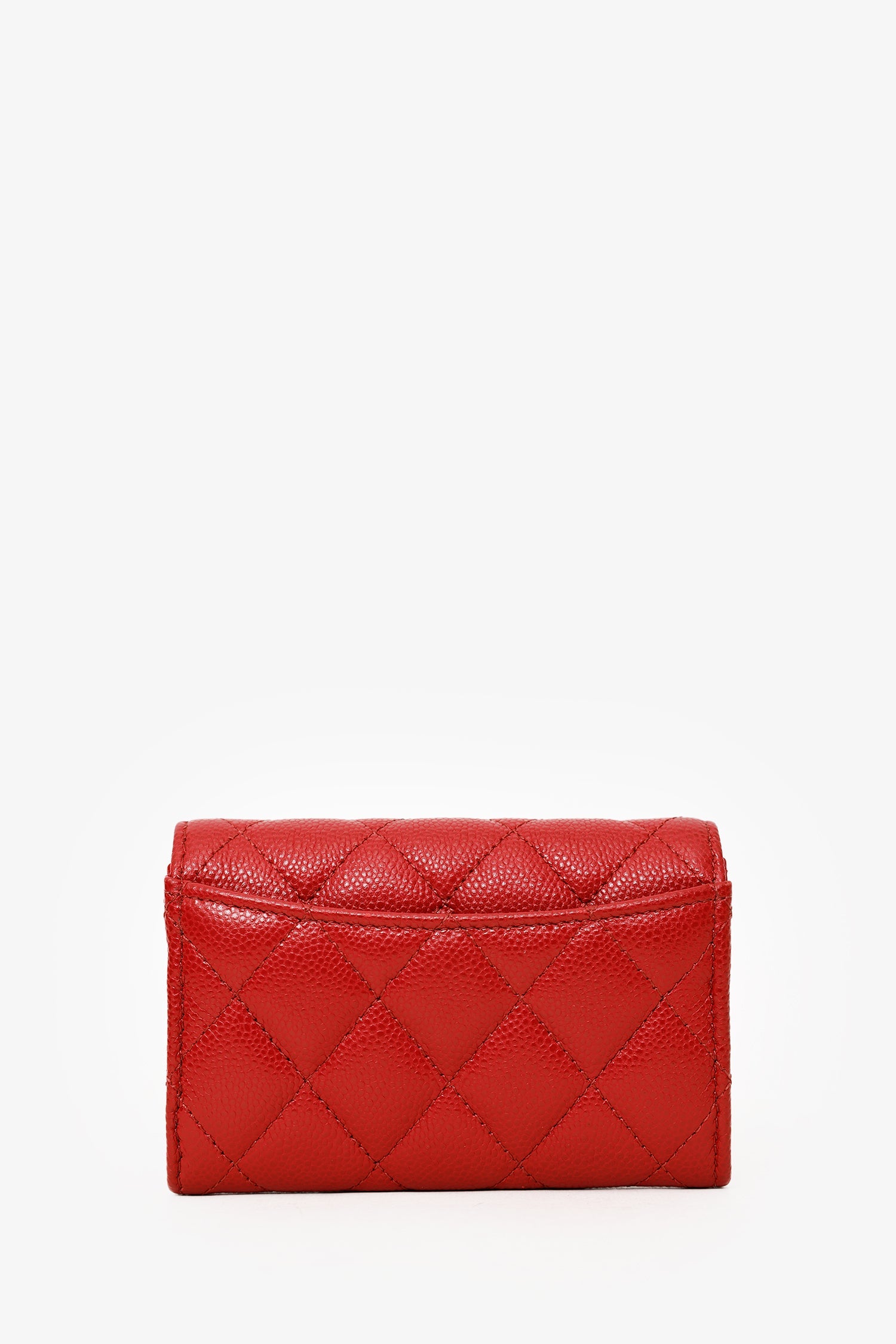 Pre-Loved Chanel™ Red Caviar Quilted Flap Card Holder Wallet. Front fold-over flap with snap-button-up closure. Single rear exterior slip pocket. Lined interior with 2 slip pockets. Gold-tone hardware. Tonal stitching.