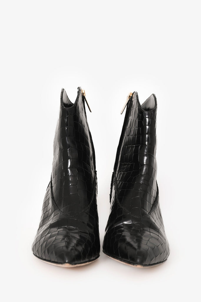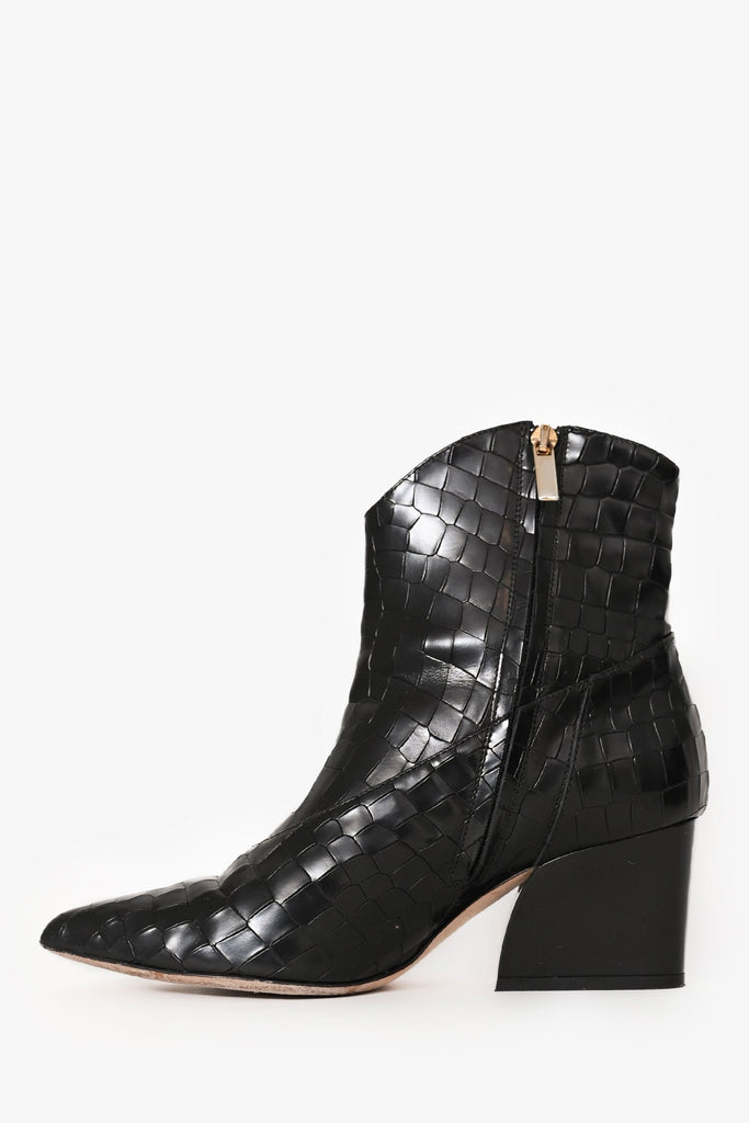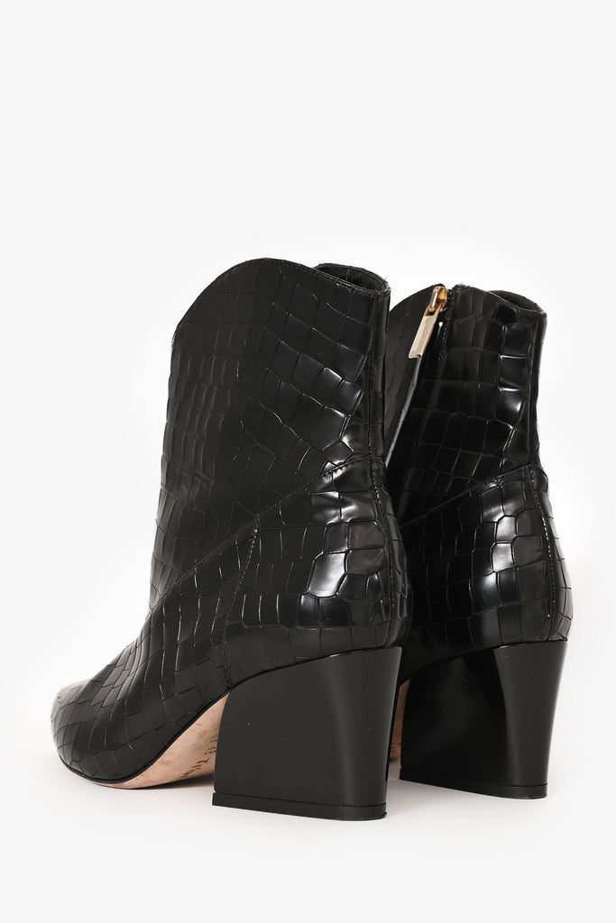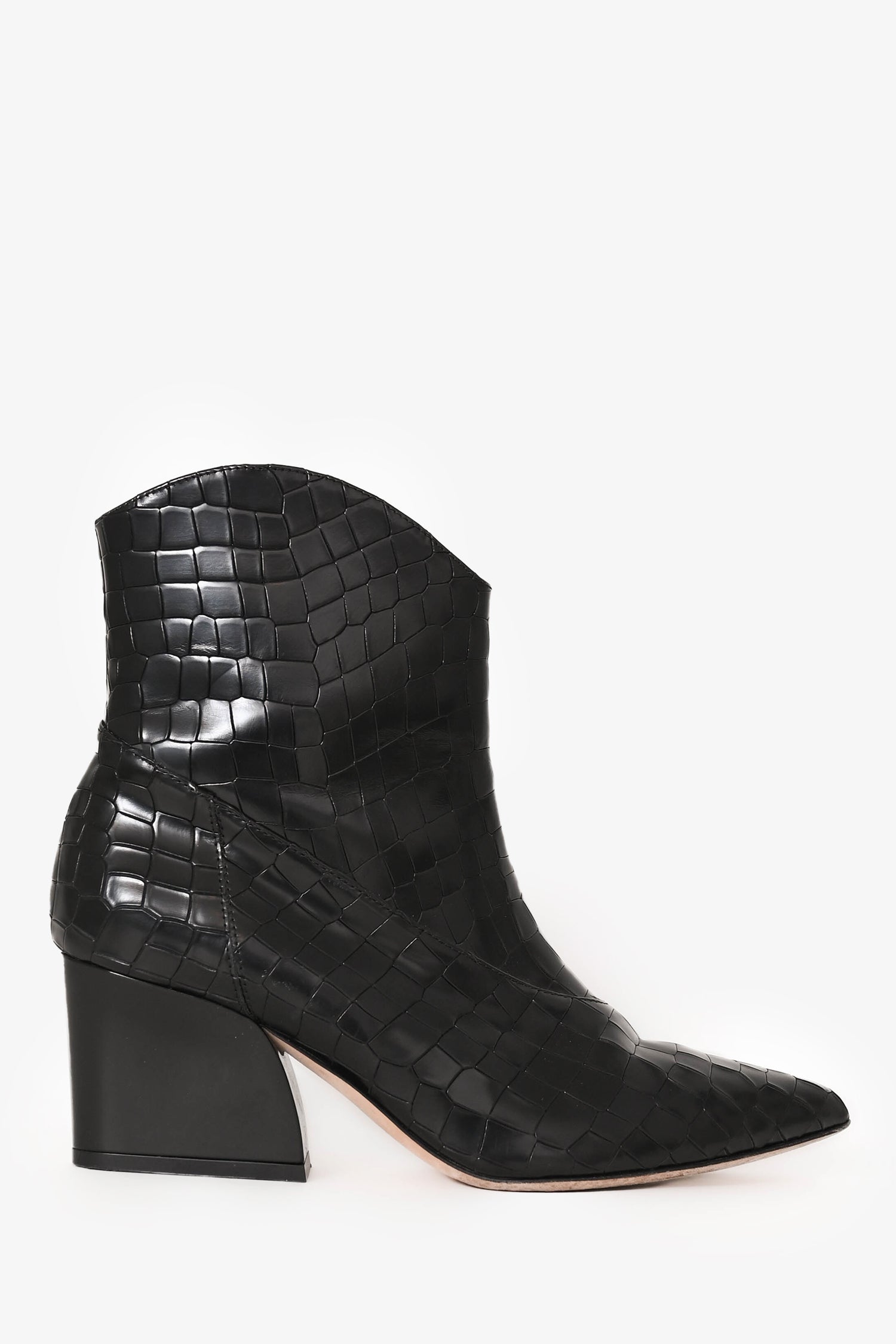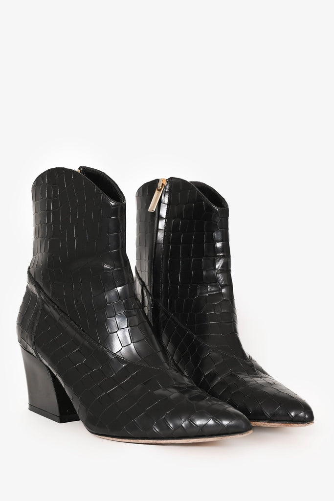 Tibi Navy Leather Croc Embossed Western Boots. Pull-on. Pointed toe. Glossy finish. Side zip closure.
